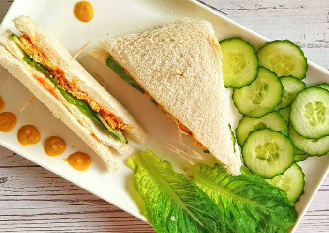 - Take 3 Bread slices Cut off the brown the sides, spread ketchup and mayonnaise on 2 slices and place lettuce leave, cucumber slices and shradded chicken tikka on third slice and place it over the one slice with ketchup and mayonnaise and flip the second bread slice with ketchup and mayonnaise over it.
